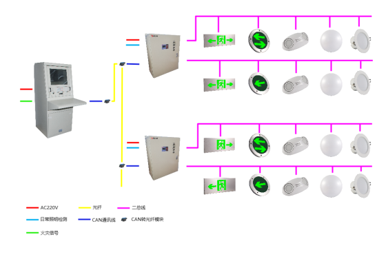 随着经济与科技的迅猛发展,人们开始追求建筑设施的人性化、现代化,大量高层建筑、特大型建筑,及地下建筑的涌现导致建筑物通道更长、更复杂。随着人们安全意识的提高,本着以人为本、生命安全为重的想法,对于人员密集、疏散距离长、疏散通道多、拐弯多、环境复杂的建筑,采用传统的疏散指示方式不能及时对灯具进行维护管理,造成火灾时大面积失效产生人员伤亡。为了避免造成群死群伤,实施迅速有效的应急疏散系统,集中控制型应急照明和疏散指示系统应运而生,可准确实现对各应急灯具的实时监控和控制、日常24小时管理维护,保证系统运行正常,在发生火灾时准确、迅速的引导人员到达安全区域,减少人员伤亡。